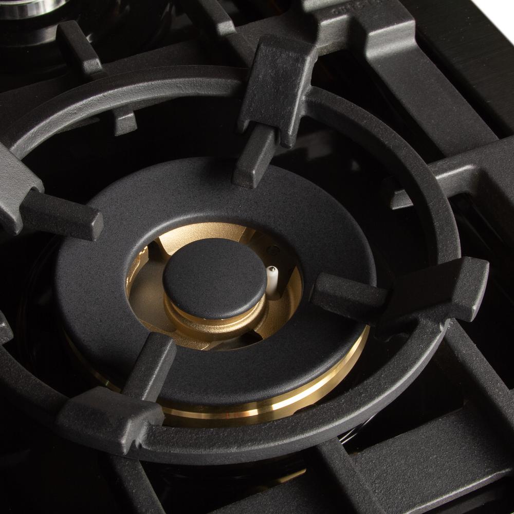 ZLINE’s professional black stainless steel is truly unique in the industry. Each piece is hand cut and crafted utilizing 304 grade stainless steel which accomplishes its sophisticated, piano black finish through a technique called bluing. The technique of bluing has been used historically to change the finish of gun barrels. The proprietary black stainless steel finish is hand soaked in a specific ratio which depicts the final and exact result of the black stainless hue. The industrial design of the RTB-36 is executed through precise lines and detailing done with a precision laser. Each model includes Italian brass burners delivering over 65,000 BTUs and also includes a durable, solid-piece Cast Iron Grill finalizing its industrial look.